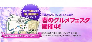 NHN Japanは、「TERA」において、本日4月10日より、お食事券10,000円がもらえる「春のグルメフェスタ」を開催する。