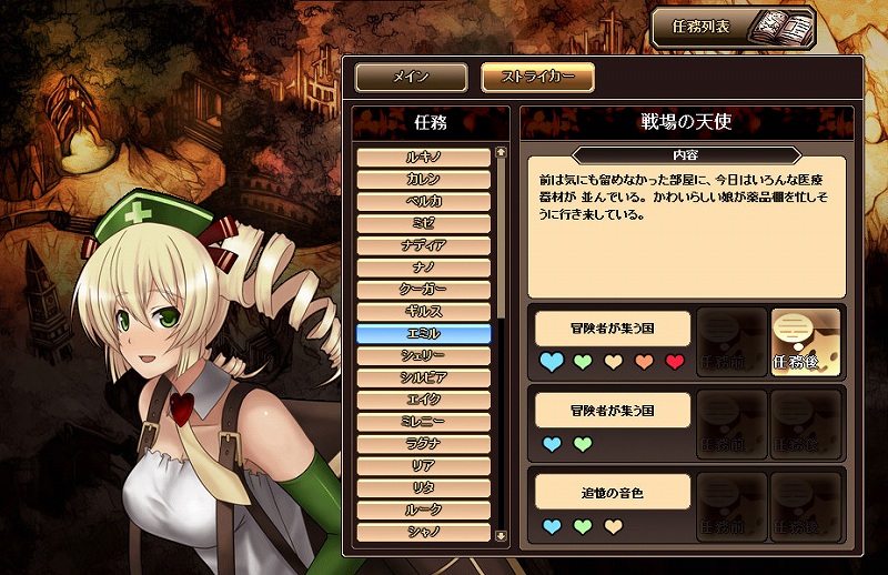 2013年4月12日(金)定期メンテナンスにて、新コンテンツ「任務会話回想機能」を実装完了いたしました。「任務会話回想機能」とは、過去クリアした任務のストーリー会話や好感度会話、そして全ての任務内容がご確認頂ける新たな機能です。