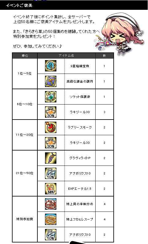 イベント終了時、アイテムを売ってGETしたポイントを集計し、各サーバーの上位50名様にご褒美アイテムをプレゼントいたします。