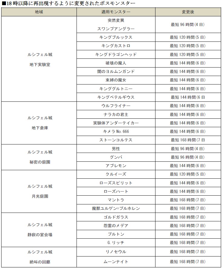 メンテナンス終了後に設定されていたボスモンスターの出現時間が大幅に変更されます。昼間の同じ時間にしか再出現しなかったボスモンスターが、会社や学校から帰った頃から再出現するようになります。