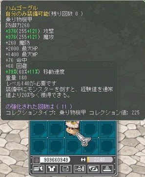 防御 +1000 重撃確率 +1 移動速度 +20% 最大重量 +3000 耐久度 180/180