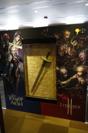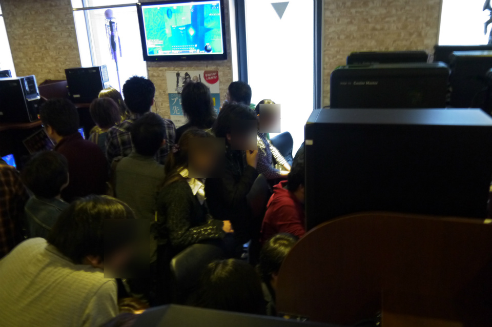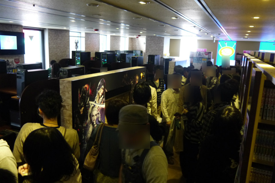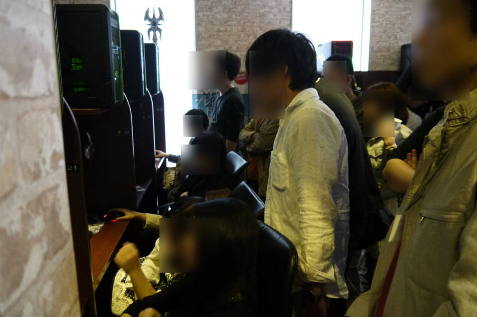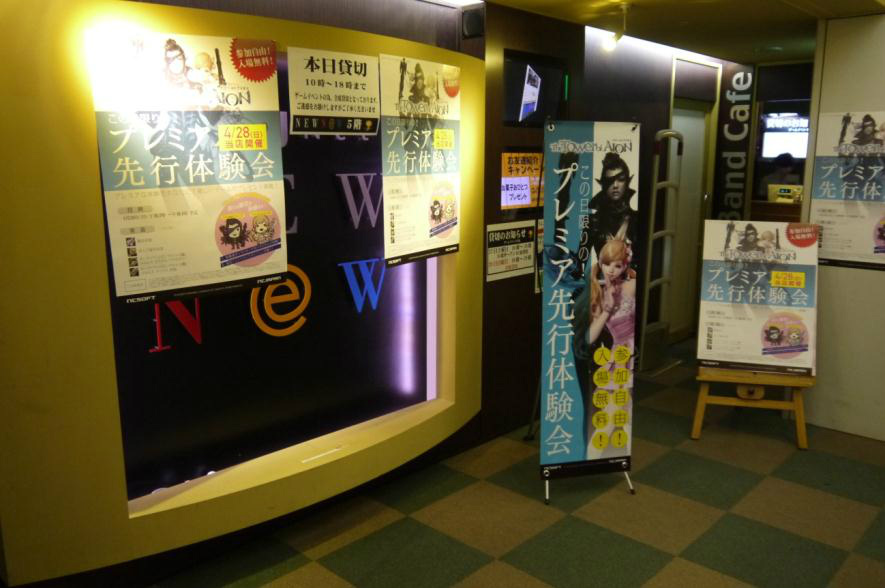 プレミア!先行体験会としては最終日となる4月28日(日)、大阪ミナミのど真ん中に位置するCafe J Net NEWNEW戎橋店がイベント会場となっていた。実はこの店舗、先日内装をリニューアルしており、さながらエヌシージャパンが提供している「リネージュ2」と「タワー オブ アイオン」のコンセプトネットカフェとも言える造りとなっており、両作品のファンタジー感を彷彿とさせる武器(レプリカ)の展示やイメージイラストがプリントされたブース壁面で装飾されている。ハイスペックPCも完備しており、かなり快適な環境を実現しているお店となっている。