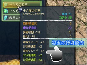 勾玉とは最大4つまで装着することが出来、防御力、ステータス上昇、スキル攻撃力上昇等、様々な特殊能力が付与されます。