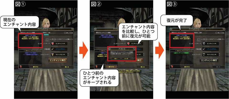図3. 復元ボタンを押すことで、ひとつ前のエンチャント内容に戻せる。