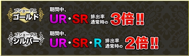 今回の「ブショーダスゴールド/シルバー確変キャンペーン」では、期間中、ブショーダスゴールドではUR・SRの排出率が通常時の3倍、ブショーダスシルバーではUR・SR・Rの排出率が通常時の2倍となり、高レアリティの強力な武将カードを手に入れる大チャンスとなっております。