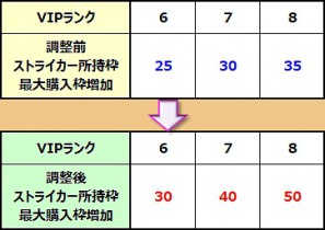 「ストライカー所持枠最大購入枠増加」の調整 2013年5月31日(金)定期メンテナンスにて、一部VIP機能を調整いたしました。 これにより、ストライカーの所持枠を購入する際、最大50枠までご利用いただけるようになりました。