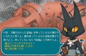 また、「鍵のかかった宝箱」はそのままでは開けることは出来ません。NPC「解錠マスター」へ「鍵のかかった宝箱」とエンジェルモールで販売されている「不思議な鍵」を持っていくことで「鍵の開いた宝箱」と交換することができます。なお、NPC「解錠マスター」へ「鍵のかかった宝箱」を持っていくと「宝箱」とも交換することができます。
