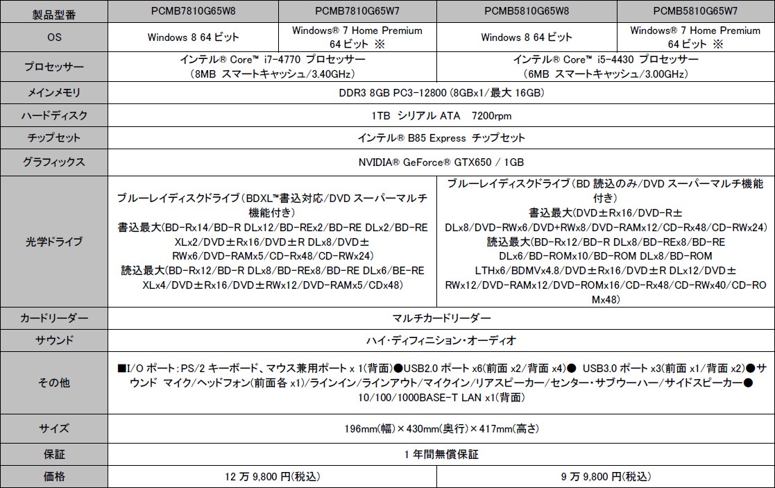 今回販売する新製品の「PCMB7810G65W8」と「PCMB7810G65W7」は、発表されたばかりの新CPU 第4世代 インテル Core i7-4770 プロセッサーを搭載、「PCMB5810G65W8」と「PCMB5810G65W7」は、新CPU第4世代 インテル Core i5-4430 プロセッサーを搭載したモデルとなります。