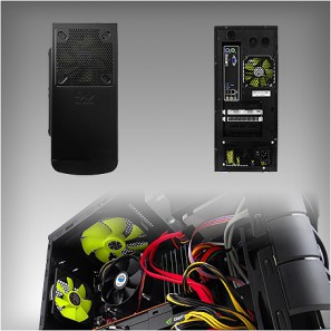 前面に設置された2つの吸気FANと、上部・背面に設置された排気FANにより、効率的なエアフローを実現。前面中央部のFANによりグラフィックスカードを、前面下部のFANによりハードディスクの冷却が行われます。