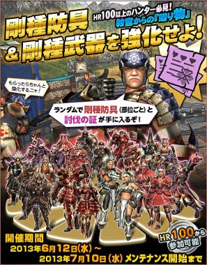 2013年7月10日(水曜日)の大型アップデートまでの期間にHR100 を突破したハンターの皆様へ、教官から剛種防具、さらには剛種武器の生産に必要な素材をプレゼント!