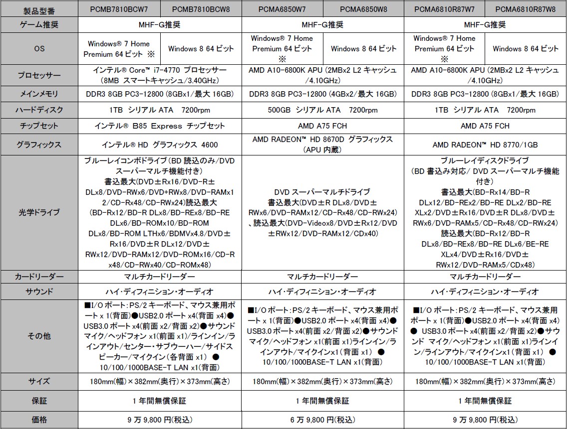 今回発売する新製品デスクトップモデルは、先日発表されたばかりの第4世代 インテル Core i7-4770 プロセッサーを搭載し、8GBメモリ、1TBハードディスク、ブルーレイコンボドライブ(BD読込のみ/DVDスーパーマルチ機能付き)を搭載し、Windows 7 Home Premium 64ビットをプリインストールした「PCMB7810BCW7」、Windows 8 64ビット(※)をプリインストールした「PCMB7810BCW8」が9万9800円となります。