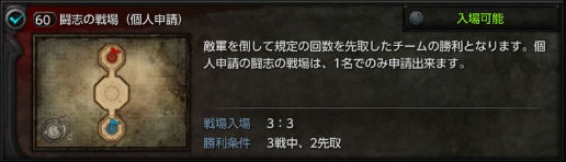 従来は、3人パーティーでないと申請できなかった「闘志の戦場」が、パーティーを組まずに個人で申請できるようになりました。