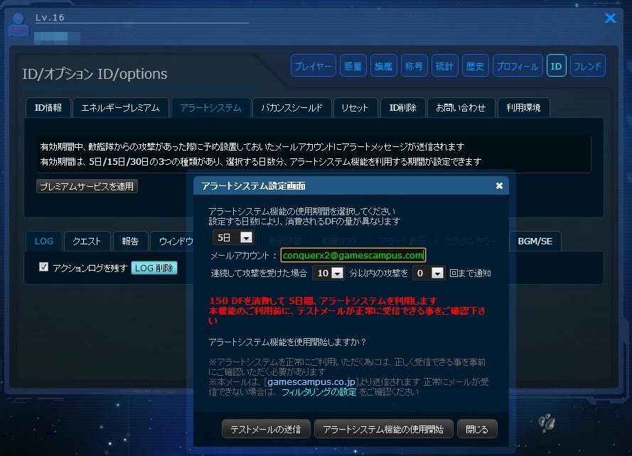 システム有効期間中に未確認艦隊から自軍の惑星に攻撃が仕掛けられた際に設定しておいたメールアドレス宛にアラートメッセージを送信するシステムです。