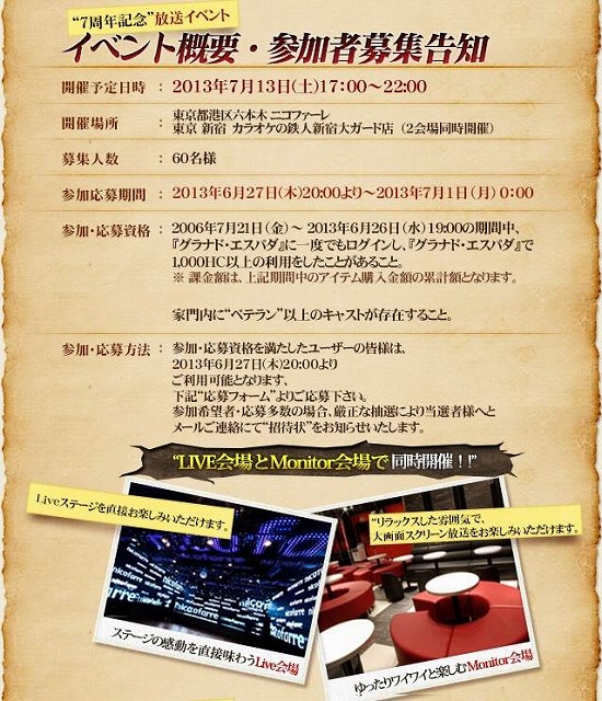 ハンビットユビキタスエンターテインメントは、「グラナド・エスパダ」において、7周年記念「オフラインパーティー」を7月13日に開催すると発表、6月27日より参加者の募集を開始した。