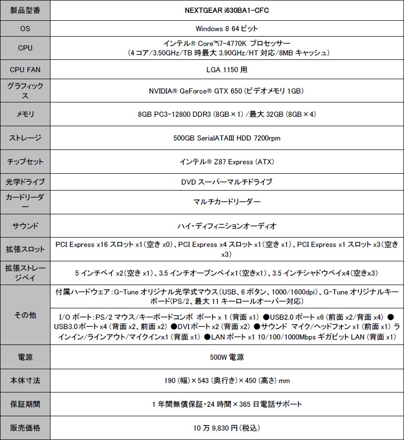 高い冷却性能と、メンテナンス性を実現した「NEXTGEARシリーズ」より、インテル Core i7-4770Kプロセッサー、8GBメモリ、500GBハードディスク、DVDスーパーマルチドライブ、NVIDIA GeForce GTX 650、500W電源を搭載し、Windows 8をプリインストールした「NEXTGEAR i630BA1-CFC」が10万9,830円となります。