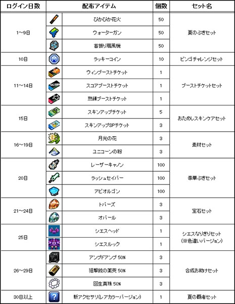 7月18日(木)のメンテナンス終了後から8月31日(土)23時59分までの間、1日1時間以上ログインした方を対象に、期間内にログインした合計日数を満たしているアイテム全てをプレゼントする「夏のプレシャスアワーキャンペーン」を開催いたします。