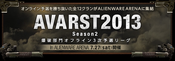 6月上旬より開催し、爆破部門772クランが出場したオンラインで行われた予選の1次、2次を勝ち抜いた計12クランによる予選リーグです。こちらの予選リーグを勝ち抜くことで8月24日(土)、25日(日)の「AVARST 2013 Season 2決勝トーナメント」へ出場することができます。こちらの3次予選リーグの様子は、全試合を生放送・生配信にて視聴可能です。