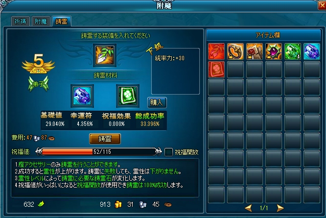 附魔に「鋳霊」機能が追加されます。「鋳霊」では橙品質のアクセサリーを強化することができ、強化すると霊性レベルと統率力を上げることができます。また、「鋳霊」を行うと祝福値が溜まります。祝福値が全て溜まると祝福開放が使用でき、鋳霊が100%成功します。「鋳霊」を行うには各種「鋳霊石」が必要となります。
