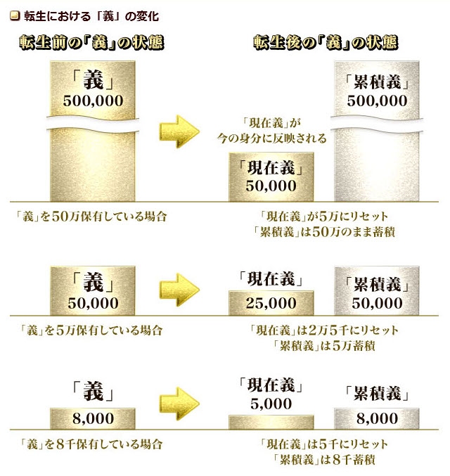 リセット後の「義」は「現在義」としてカウントされ、所属勢力内における身分昇格の条件などとして機能します。いっぽう全プレイ期間を通じて獲得してきた「義」の総計は「累積義」としてカウントされ、ゲームにログインすることで1日1回獲得できるログインボーナス「義」の計算に用いられます。結果として「累積義」が多いほど、身分昇格が早くなります。
