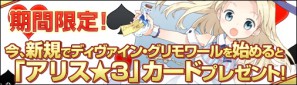 期間中、「ディヴァイン・グリモワール」を新規に開始された方に、イベントカード「アリス(★3)」を1枚プレゼントいたします。