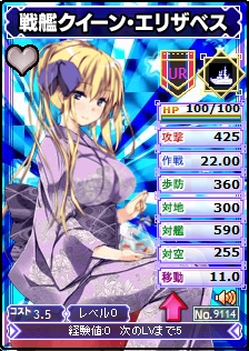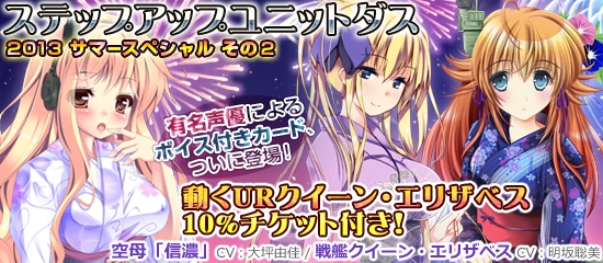 このステップアップユニットダスのラインアップには、本作で初となる、人気声優の明坂聡美さんや大坪由佳さんを起用したボイス付きカードが含まれています。さらに、明坂聡美さんが声を担当した、浴衣姿の戦艦クイーン・エリザベスは、しゃべるだけなく、カードがアニメーションする、動いてしゃべるカードとなっております。