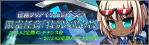 2013年8月2日(金)定期メンテナンスにて、期間限定エブリー任務「特別な贈り物」を追加いたしました。エブリー任務「特別な贈り物」をクリアすると、報酬として「S-Box」を獲得できます。「S-Box」を使用すると、「Sチップ」の素材となる「Sフラグメント」が手に入ります。さらに、運が良ければ、なんと「Sチップ」を直接GETするチャンスもあります。この機会に素敵なストライカーをあなたの仲間に加えましょう。