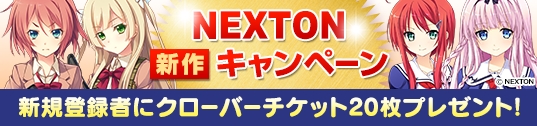 【NEXTON】の新作ラッシュを記念してメガミエンゲイジ!に新規登録いただいた方全員に、【NEXTON】作品のカードが引ける召喚くじクローバーチケット20枚をプレゼントいたします。