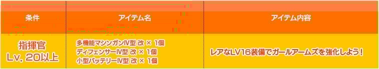キャンペーン期間中、指揮官であるプレイヤー自身のLvを20以上に育て上げると、レアなLv16装備セットをプレゼントいたします。ショップで購入できる装備品よりも高いランクの良品質装備なので、このチャンスにキャラクターを育て上げ、レアな武器を手に入れちゃおう!