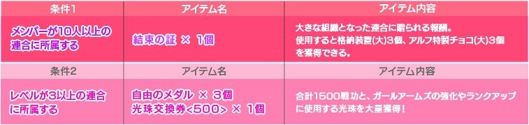 キャンペーン期間中、特定条件を満たすことに成功した連合には、その連合に所属するメンバー全員に対し、達成条件ごとに素敵なアイテムをプレゼントいたします。ゲームに少しずつ慣れてきたら、次は一緒に原生種と戦う仲間を探しましょう!