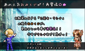 2013年8月8日(木)定期メンテナンス後から、運試しができるスペシャルイベントを開催いたします。イベント期間中、「クリムゾンシティ中央広場」にいるNPC「巳巫女・クシナ」を訪ねると、素敵なアイテムが当たる「おみくじ」を購入できます。
