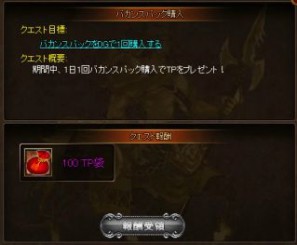 1日1回、バカンスパックを購入すると、「クエスト」の[イベントクエスト]タブに表示されるクエスト「バカンスパック購入」から「100 TP袋」が受け取れます。「100 TP袋」を英雄画面の鞄内で使用することでTPに加算されます。