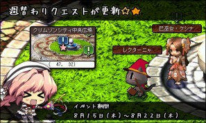 2013年8月15日(木)定期メンテナンスにて、週替わりクエストを更新いたしました。週替わりクエストはその名のとおり、定期メンテナンスごとにクエスト内容を変更し、毎週異なるお仕事や報酬がお楽しみいただけます。