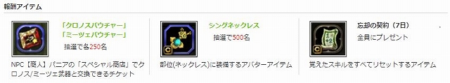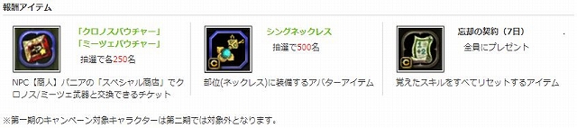 「Lv,70 にしようぜ!キャンペーン」では、9月25日(水)までにLv.70 に育てたキャラクターにもれなく豪華アイテム「忘却の契約(7日)」をプレゼント! さらに抽選で、武器アバターと交換できる「クロノスバウチャー」「ミーツェバウチャー」、レア等級「シングネックレス」をプレゼントします。