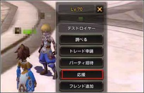 他のキャラクターを左クリックすると表示されるメニューに「応援」ボタンを追加しま