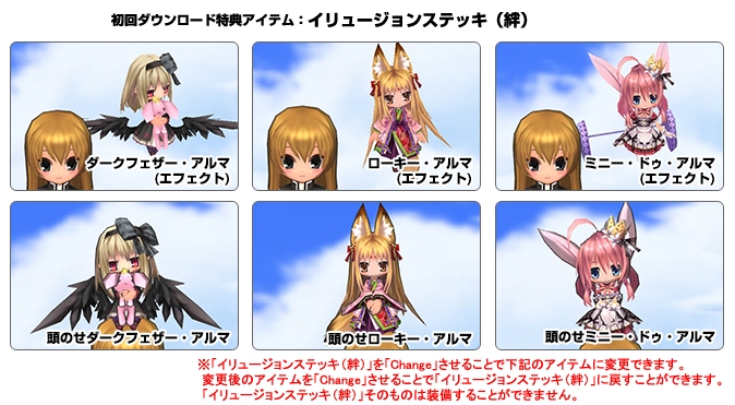 CD初回特典には、チェンジすることで「ダークフェザー・アルマ」「ローキー・アルマ」「ミニー・ドゥ・アルマ」をモチーフにしたエフェクト装備や頭のせ装備に変化するゲーム内アイテム「イリュージョンステッキ(絆)」付き。可愛らしいアルマモンスターたちの魅力がたっぷりつまった「エミル・クロニクル・オンライン アルマモンスターキャラクターソングCD」をぜひお聴き下さい!