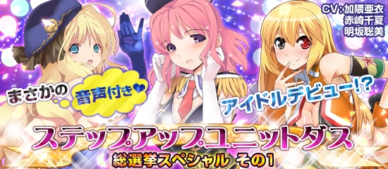 「ステップアップユニットダス 総選挙スペシャルその 1」で追加されるのは、総選挙で 3位、6位、10位となった擬人化美少女で、それぞれのボイスを人気声優の赤崎千夏さん、明坂聡美さん、加隈亜衣さんが担当しております。