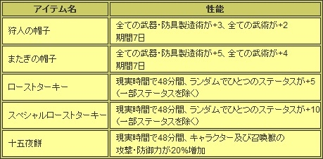 イベント期間中で「イヴラ」や「クッキー」などから集めたイベントアイテムで、「またぎの帽子」や「スペシャルローストターキー」などのイベント限定アイテムが製造できます。これらのアイテムが製造できるのは今だけ!