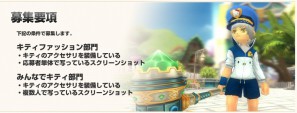 「キティファッション部門」では、お気に入りのファッションを身にまとったマイキャラクターのスクリーンショットを募集します。注意事項をしっかり読んで、自慢の衣装を身につけたら、今すぐ応募しよう!「みんなでキティ部門」では、キティアイテムを身につけた、複数人でのスクリーンショットを募集します。ギルメン・パートナー・キティ友と一緒にパチリと撮った、とっておきをご応募ください。