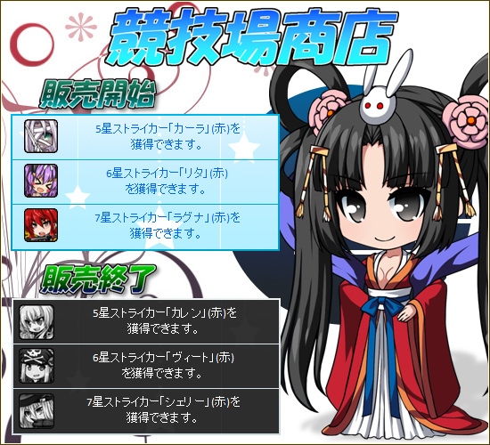 2013年9月13日(金)定期メンテナンス後から、「夜天箱」を販売いたします。「夜天箱」を使用すると正義のヒーローに憧れる自称天才魔術師「ルティス」や異世界から来た神の血族「ヴァティー」など、可愛さと気高さいっぱいのストライカーが手に入るチャンス。どうぞ、お見逃しなく!