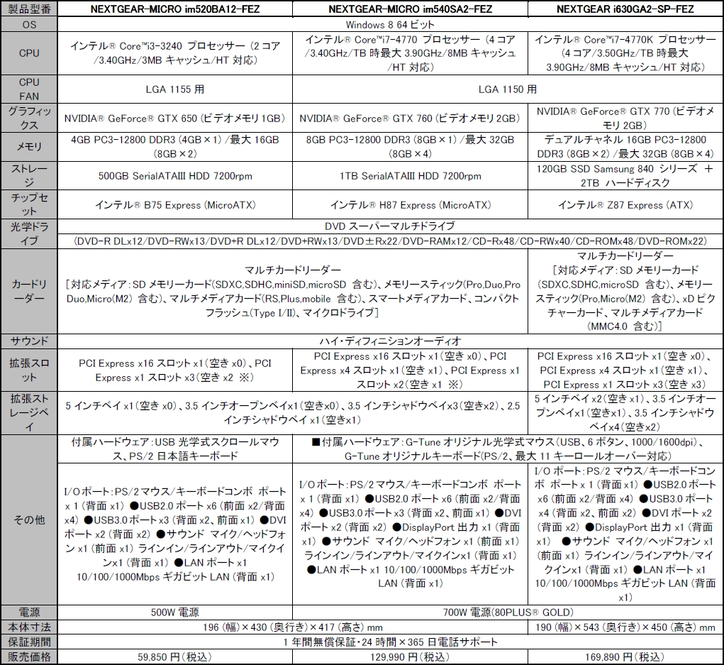 「FEZ」のエントリーモデル「NEXTGEAR-MICRO シリーズ」として、インテル Core i3-3240 プロセッサー、4GB メモリ、500GB HDD、DVDスーパーマルチドライブ、NVIDIA GeForceGTX650、Windows 8をプリインストールした「NEXTGEAR-MICRO im520BA12-FEZ」が5万9,850円。