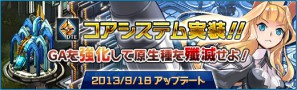 2013年9月18日(水)定期メンテナンスにて、新システム「コア」を実装いたしました。「コア」とは、指揮官であるプレイヤーのレベルが30になると自動に建設される施設「コア解析所」から生産し、通常の武装アイテムとは別枠で装備できる新たなGA強化アイテム。晶石、戦功、輝晶を消費することで、それぞれの対象となる初級研究、中級研究、上級研究が行え、ランダムで「コア」が生産されていきます。