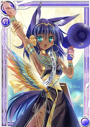 さて、こちらは煽情的な褐色肌の少女パピルス。彼女は古代文明の副葬品でしたが、ある約束のもと、ラーナという少女の肉体を譲り受けた謎多き女の子です。エジプトの月の神「トト神」をイメージした服装を身に纏い、「月・そしてトト神様をよろしくお願いします!」…と、応援中。どうやら、お月見を勘違いしているようですが…。