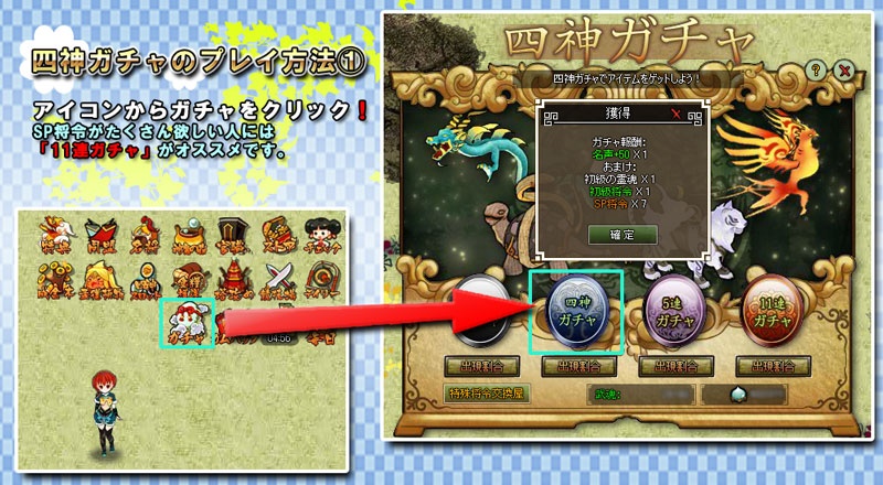 四神ガチャウィンドウが表示されたら、自分のプレイしたい回数に応じて「四神ガチャ」、「5連ガチャ」、「11連ガチャ」ボタンをクリックしましょう。ゲーム内で役立つアイテムと共に、おまけとして「SP将令」を獲得できます。