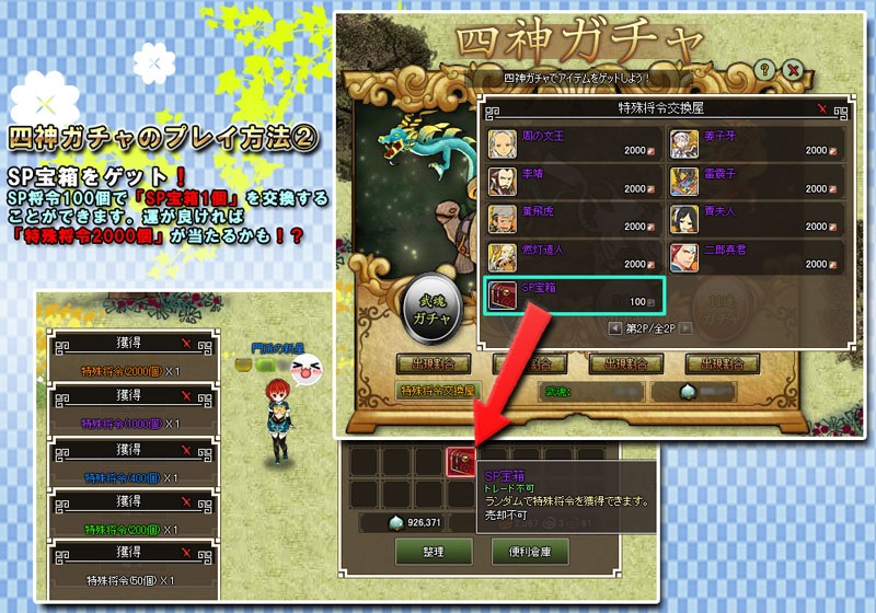 キャンペーン期間中「四神ガチャ」をプレイすると、おまけアイテムである「特殊将令」の代わりにキャンペーン専用アイテム「SP将令」が排出されます。また、SP将令を100個集めると、キャンペーン専用アイテム「SP宝箱」と交換することができ、SP宝箱からは最大で2000個の特殊将令が入手できます。欲しかったあの名将を一発ゲットできちゃうかも!?