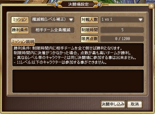 1:1/3:3/5:5の人数でモードに応じルールを持って戦います。勝利チームには友好神ポイントとゲームマネー、経験値やアイテムが与えられます。レベル10以下のキャラクターは決闘場を利用出来ません。決闘途中プレイヤーが離脱すると、ペナルティがつきます。