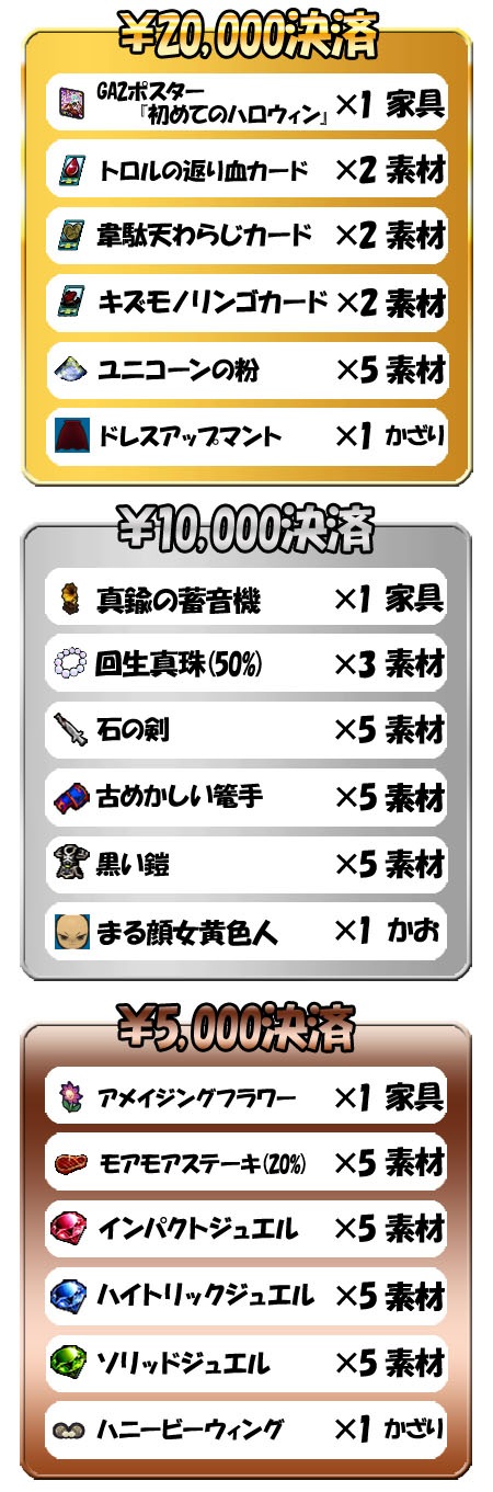 2013年10月3日(木)のメンテナンス終了後から2013年10月31日(木)9時59分までの間、一度に5000円以上の課金決済をされた方に素敵なプレゼントを致します。