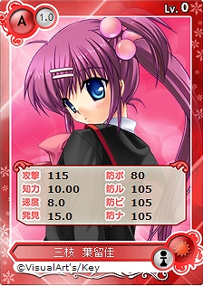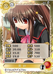 VisualArt’s/Keyの人気作「リトルバスターズ!」がアニメ放送に合わせて登場!また同ブランド「Rewrite」からメインヒロインたちが期間限定で登場いたします。今回登場する限定カードはVisualArt’s/Keyの「リトルバスターズ!」から「棗鈴(SS)」、「三枝葉留佳(A)」、「Rewrite」から「鳳ちはや(S)」の3枚となります。