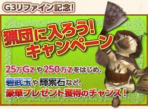 10月16日(水)に予定しているG3アップデートで猟団コンテンツがリファインされることを記念し、下記対象期間内に1回以上ゲームにログインし、かつ下記の集計日時に「猟団員数が一定人数