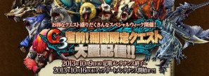 10月9日からの期間限定クエスト公開!お得なクエスト大量配信なスペシャルウィーク!部位破壊でレア素材が獲得しやすいG級クエストを、期間限定で大量配信!GR1~6モンスターの部位破壊を達成することによってレア素材が獲得しやすくなるクエストを配信いたします。