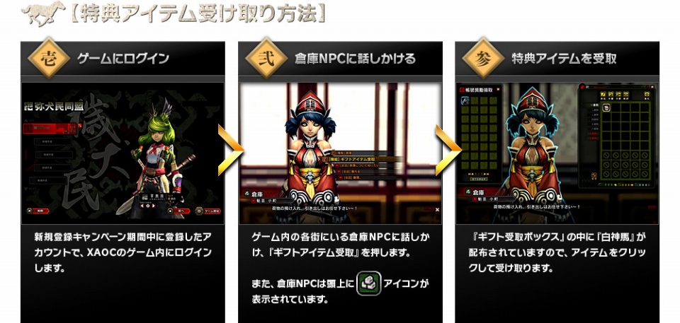 オープンβテストを記念して、新規登録キャンペーンを実施いたします。キャンペーン期間中、UJJ新規会員登録を行い「ザオック」をアクティブ化してくれた方にオープンβテスト時から使用できる限定騎乗ペット「白神馬(専)」をプレゼントいたします。既存UJJ会員の方は、「ザオック」のアクティブ化のみで大丈夫です。このチャンスに登録して素敵なアイテムをGETしましょう!